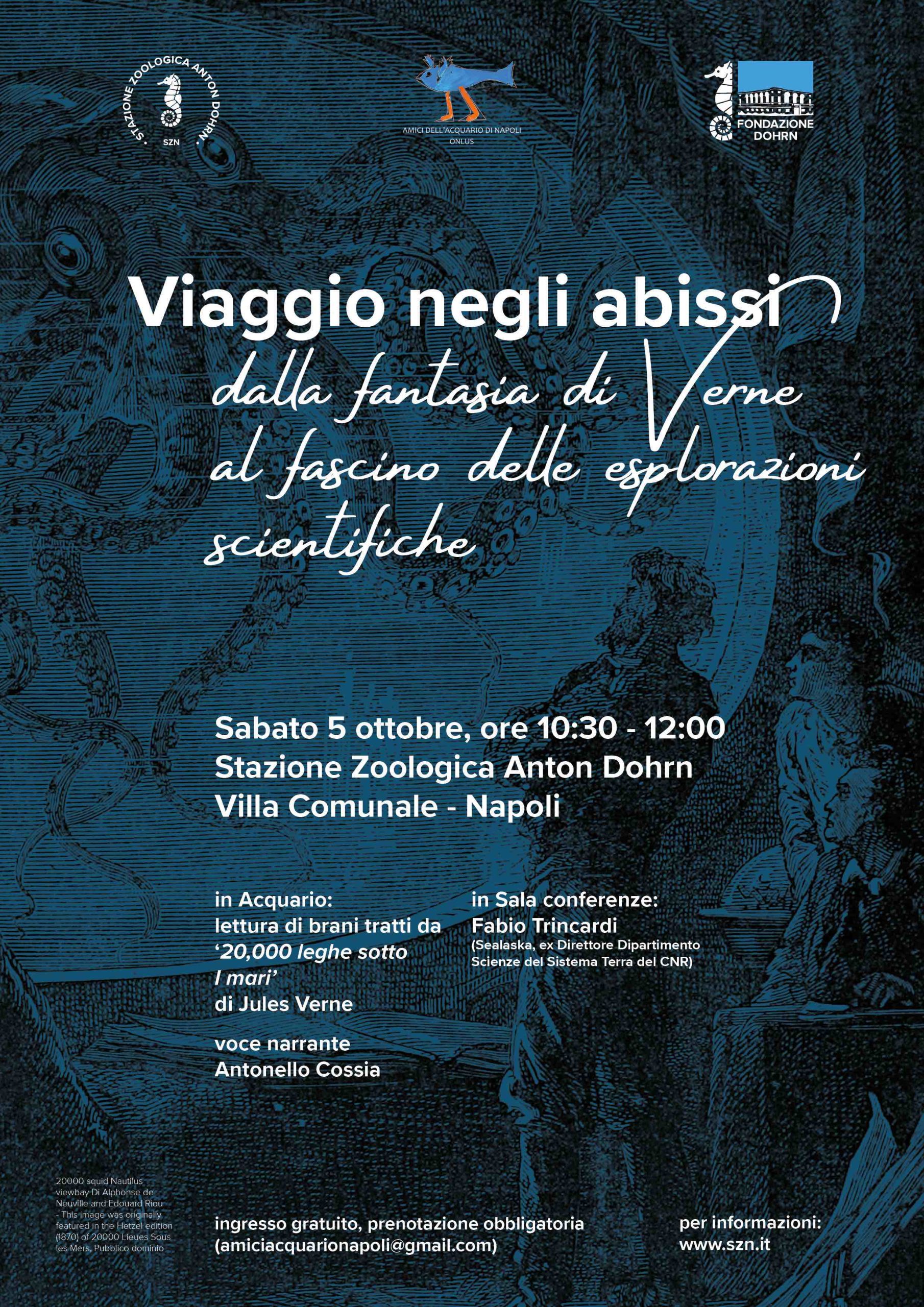 Alla scoperta dell’Acquario di Napoli accompagnati dalla voce di Antonello Cossia, che legge brani tratti da “Ventimila leghe sotto i mari” il romanzo visionario che Jules Verne scrisse nel 1870 e che racconta l’avventuroso viaggio del sottomarino Nautilus nelle profondità degli oceani A seguire, Fabio Trincardi (Sealaska, ex Direttore Dipartimento Scienze del Sistema Terra del CNR) ci illustrerà le sfide tecnologiche che l’uomo ha affrontato per poter esplorare le profondità marine.